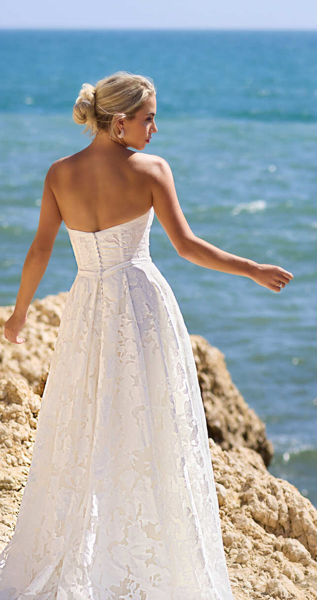 Dieses Brautkleid vereint sommerliche Frische mit sinnlicher Raffinesse. Der herzförmige Ausschnitt und der schmale Taillenbund unterstreichen die feminine Silhouette, während der weiche A-Linien-Rock mit hoher Beinschlitztiefe für einen modernen Akzent sorgt.