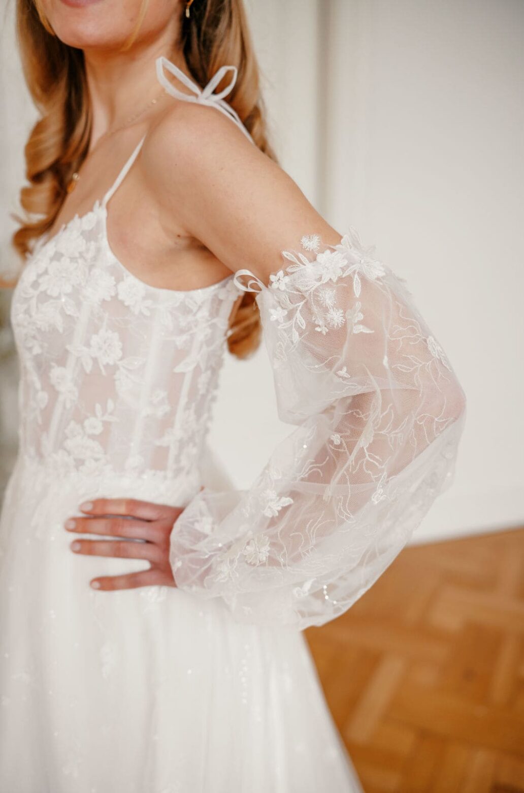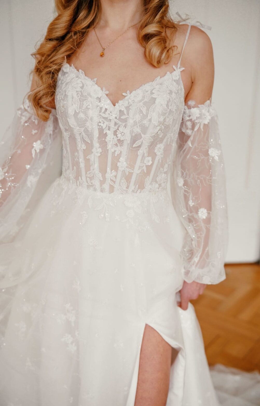 Das Oberteil aus zartem Illusionstüll ist mit fein applizierten Blüten bestickt, die fast wie auf die Haut gezeichnet erscheinen. Die schmalen Spaghettiträger werden von abnehmbaren, voluminösen Puffärmeln ergänzt, die für einen romantischen Akzent sorgen. Ein Herzdekolleté mit dezentem V-Einsatz verleiht dem Kleid eine moderne Note. Der Rock fällt in sanfter A-Linie, ist mit floralen Details durchzogen und bietet durch den hohen Schlitz ein unerwartetes, selbstbewusstes Detail. Eine leichte Schleppe rundet das Gesamtbild ab und sorgt für festliche Eleganz.