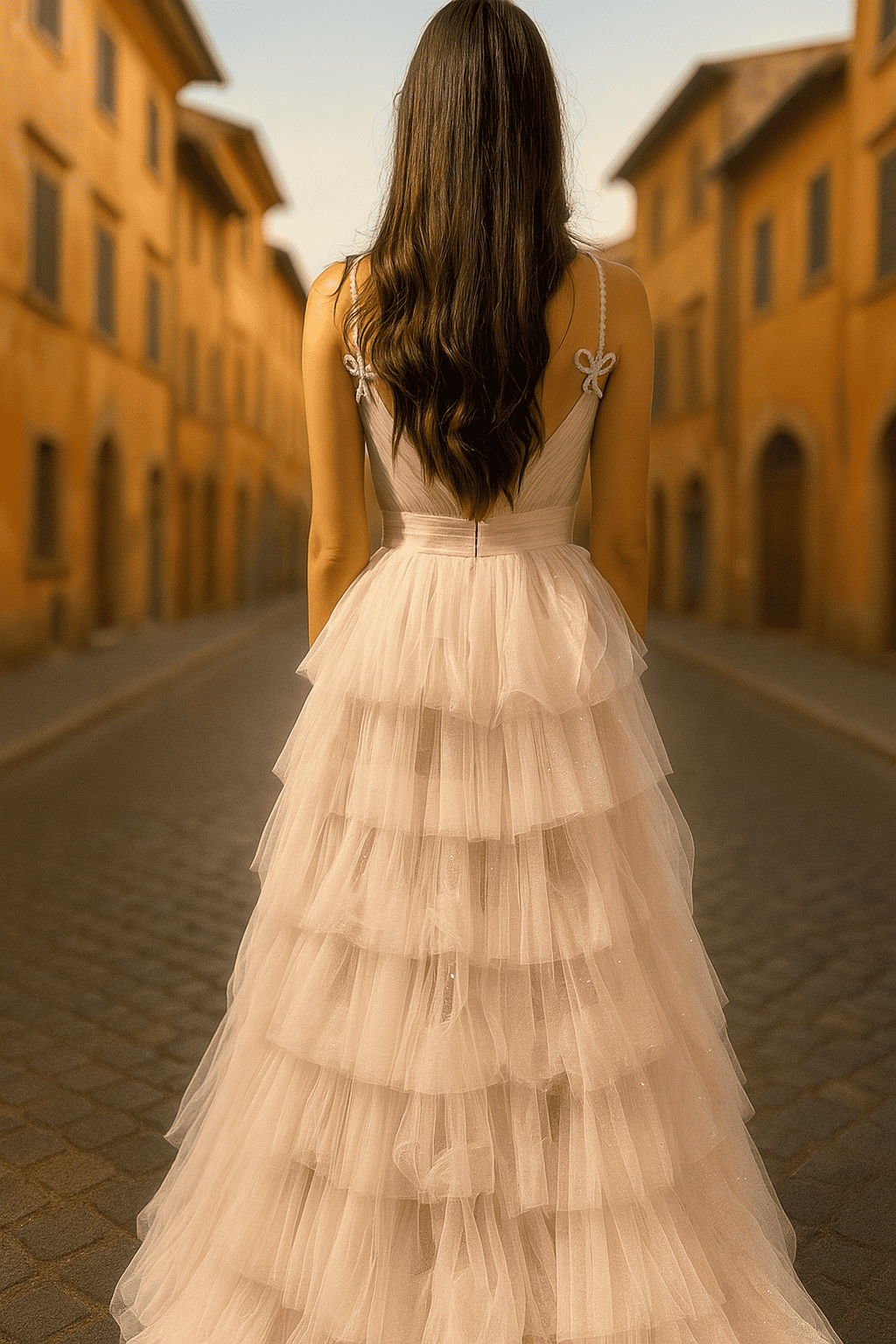 Das Oberteil begeistert mit einem tiefen V-Ausschnitt, der das Dekolleté stilvoll in Szene setzt und durch feine, schmale Träger mit kleinen Schleifendetails besonders zart wirkt. Die leicht geraffte Verarbeitung im Bustier und im Taillenbereich schmeichelt der Figur und formt eine wunderschön definierte Taille. Ab der Hüfte öffnet sich das Kleid in eine weich fallende A-Linien-Silhouette mit mehrlagigen Tüll-Volants, die dem Design Tiefe, Volumen und eine luxuriöse Leichtigkeit verleihen. Auch die Rückenansicht bleibt klar und elegant – mit tief ausgeschnittenem Rücken, feinen Trägern und einem sauber eingearbeiteten Reißverschluss. Der zart warme Off-White bis Blush-Nude-Ton unterstreicht die romantische Ausstrahlung des Modells.