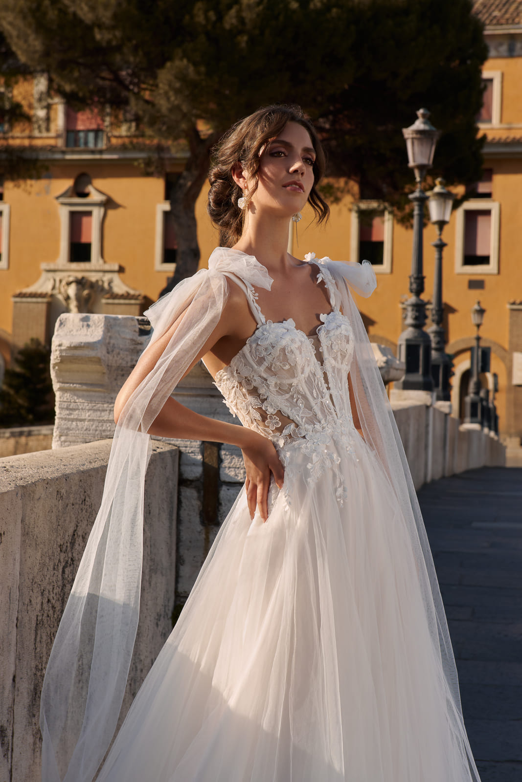 Beschreibung Zarte Leichtigkeit mit modernem Korsett-Look Ein Brautkleid, das die Balance zwischen sinnlicher Transparenz und romantischer Anmut meistert: Modell Marine