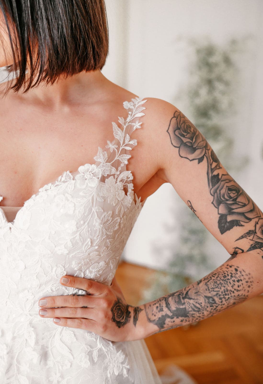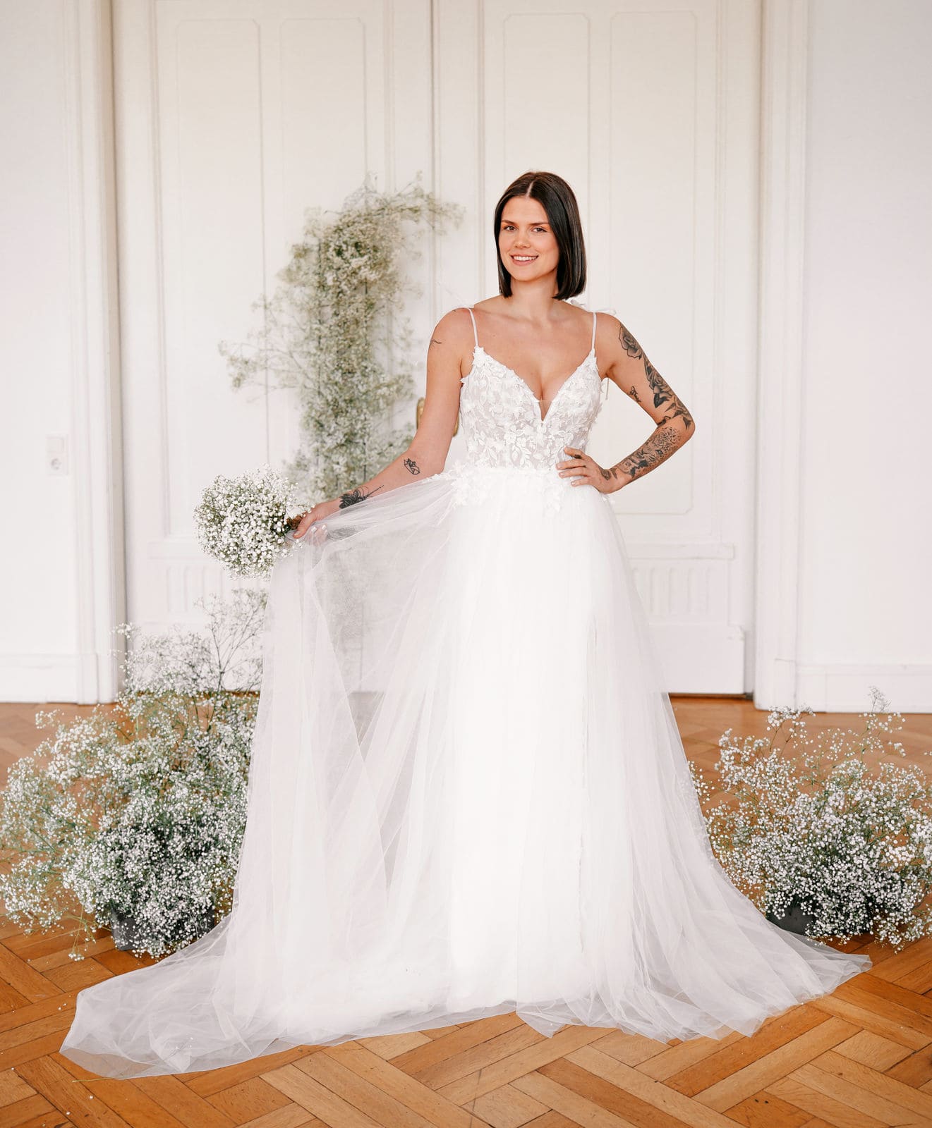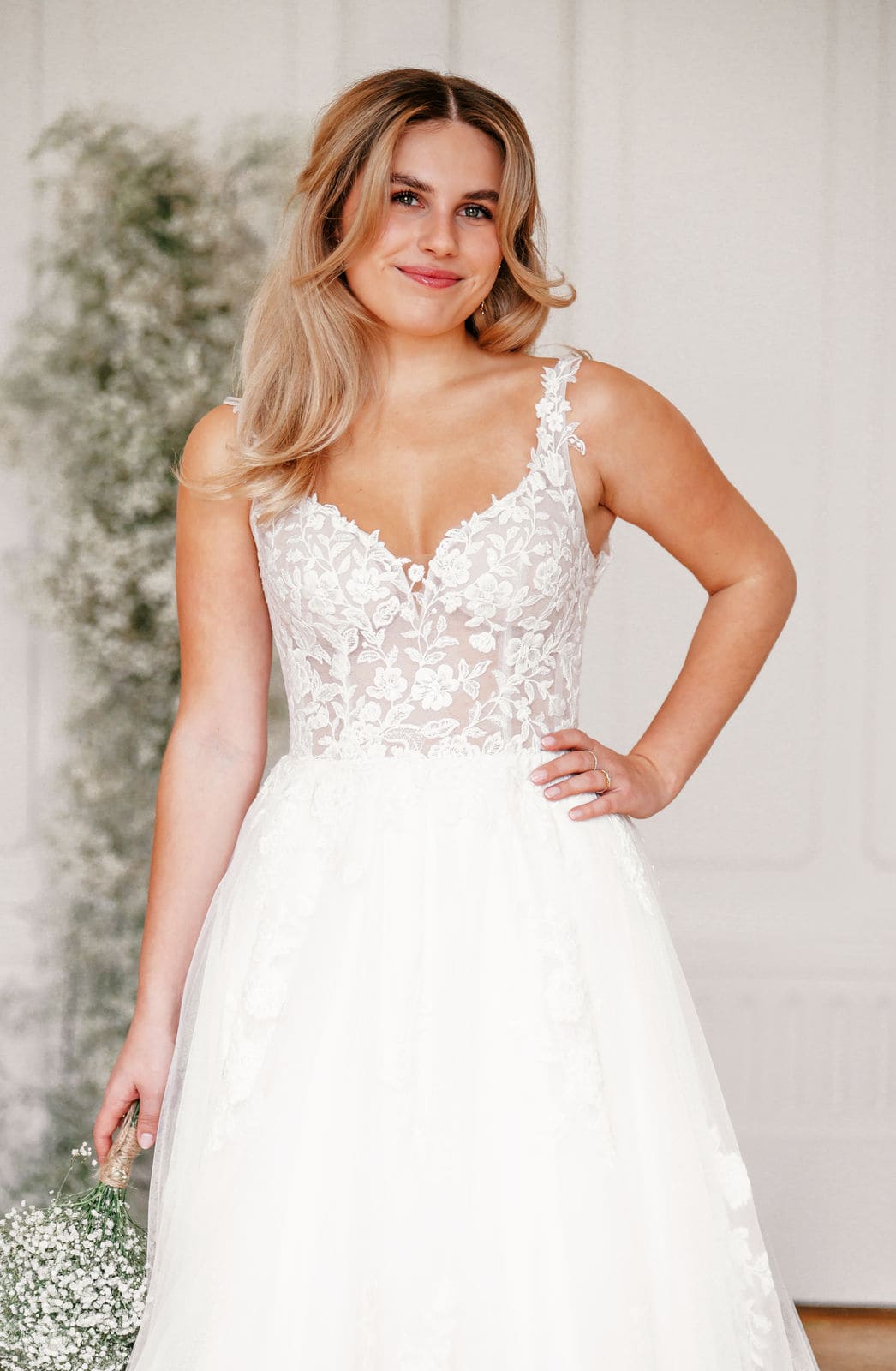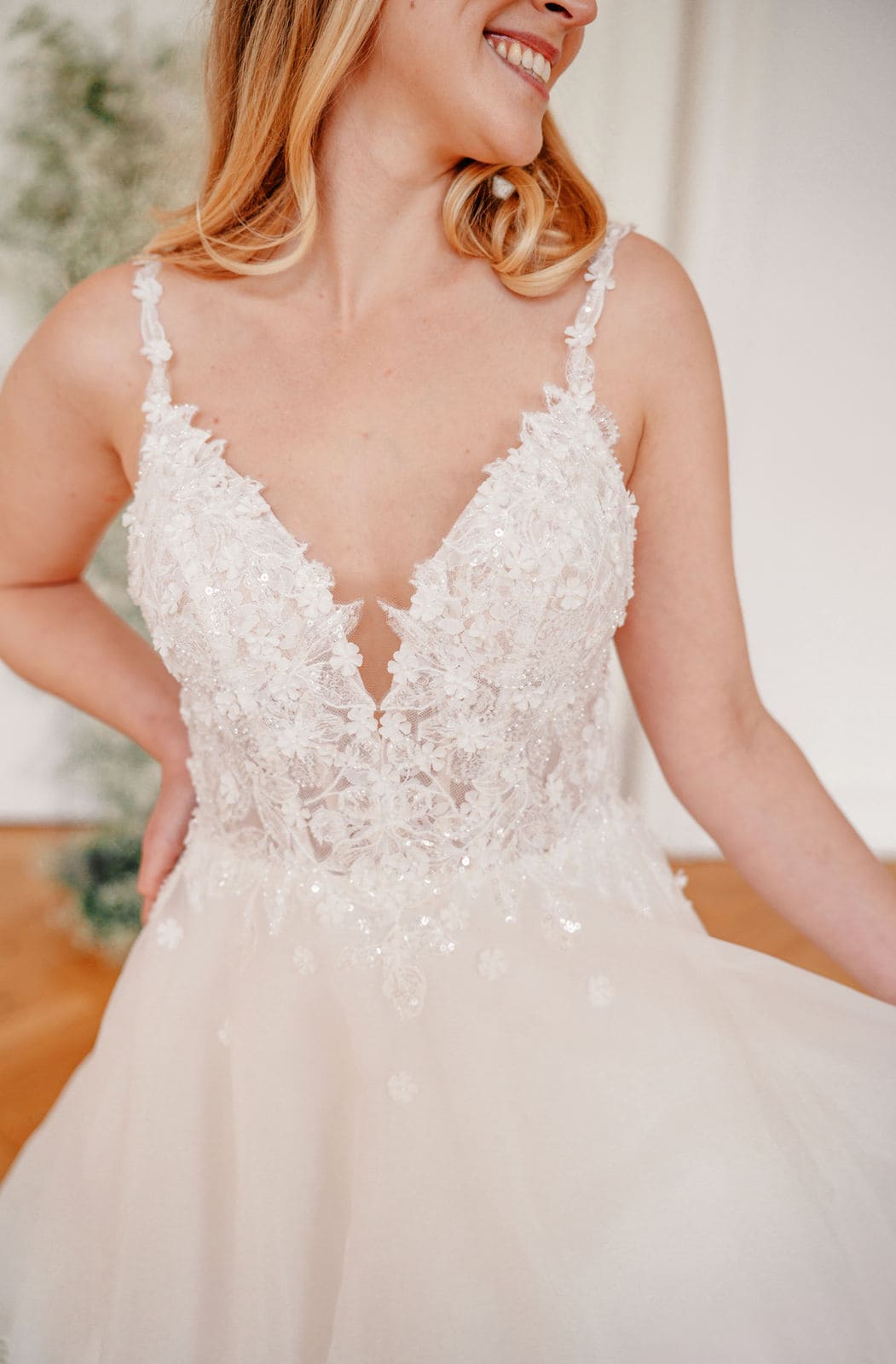 Das Brautkleid „Lacey“ von Sanna Lindström ist ein wahres Meisterwerk, das durch seine feminine Eleganz und moderne Raffinesse besticht. Der tiefe V-Ausschnitt im Dekolleté, der bis in die Taille reicht, verleiht diesem Kleid eine sinnliche Note, während die floralen Applikationen auf dem transparenten Mieder für einen Hauch Romantik sorgen.